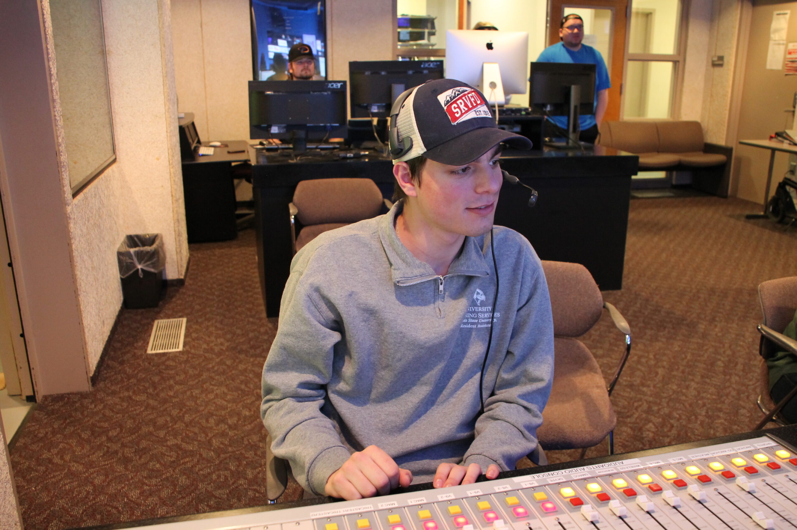 In 100-level classes (COM 163 TV Production and COM 167 Broadcast News), students take entry-level roles in the daily live shows and get accustomed to the newsroom and control room.